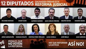 Buenos Aires 22 de abril.- La ONG Poder Ciudadano dio a conocer una lista de doce Diputados Nacionales, quienes con su voto podrían impedir la aprobación de tres leyes, enviadas por el Ejecutivo, en torno a la democratización de la Justicia. En dialogo con Diario de Cuyo online, el sanjuanino dijo que “vamos evitar el tratamiento y la aprobación de los tres graves proyectos que fueron aprobados por el Senado”.