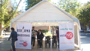 San Juan, 2 de mayo.- A menos de una semana del plebiscito, un grupo de jóvenes identificados con distintas agrupaciones políticas (Convicción Federal, Juventud Solidaria, Franja Morada, CEPA, PRO, Juventud Peronista) y otros autoconvocados, que se definen como “ciudadanos que quieren votar” instalaron una carpa en la Plaza 25 de Mayo. César Gioja, estuvo presente apoyando esta iniciativa.