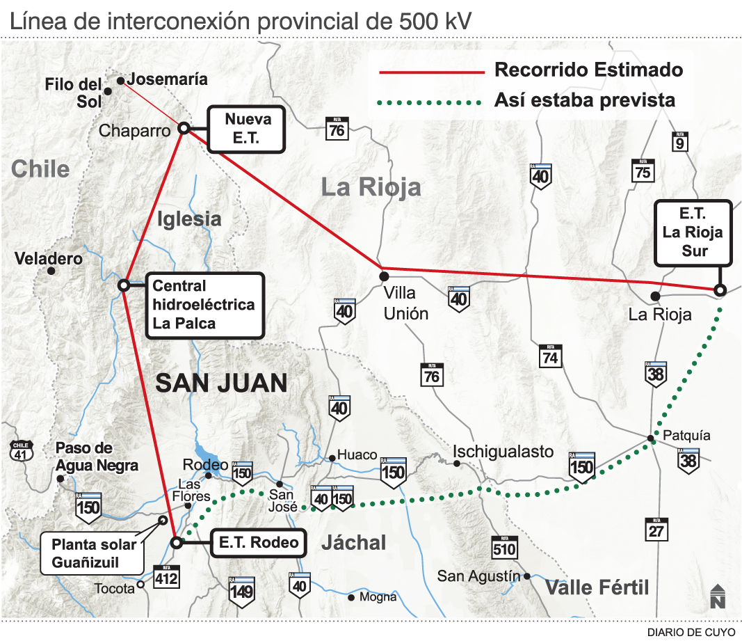 Por su parte, el ministro de Obras y Servicios Públicos, Julio Ortiz Andino, aseguró que "la empresa va a necesitar toda la línea por lo que la va a financiar completa. Luego, habrá que ver después qué parte de esa inversión es lo que se va a descontar de regalías". Además, dijo que el proyecto actual implica un trazado que saldrá desde la ET Rodeo, pasaría por la zona de La Palca, donde se proyecta una estación hidroenergética, para luego llegar a una localidad al Norte llamada Chaparro, donde se instalaría otra estación transformadora. Desde ahí saldrían dos líneas, una de menor tensión hacia el proyecto minero y otra hacia La Rioja (ver infografía).