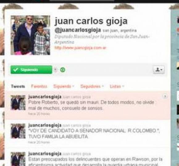 "Pobre Roberto, se quedó sin Mauri. De todos modos, no olvide: mal de muchos, consuelo de sonsos (SIC)", twitteó ayer Juan Carlos Gioja, sobre Mauricio Ibarra, en medio de la puja rawsina. Ibarra luego, por la misma vía, respondió duro: "Juan Carlos, si fueras hijo único no existirías… Ponete a trabajar, todos sabemos que el trabajo nunca fue tu fuerte".
