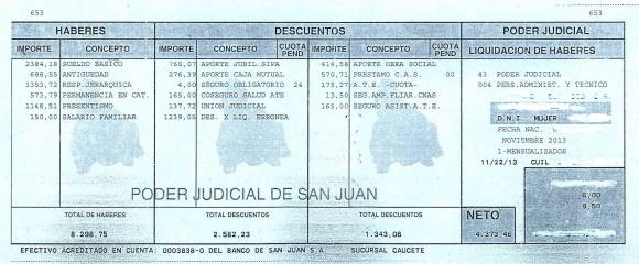 La presentación legal, que al final recayó en el Juzgado Civil Nro 1, a cargo de Héctor Rollan, es para que la Corte de Justicia de San Juan haga marcha atrás con las rebajas de sueltos practicadas al personal y que aparecen en el último recibo de haberes como “Des. x liq. errónea” (ver facsímil).