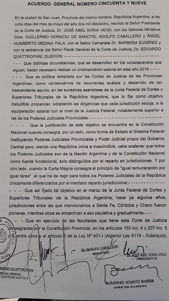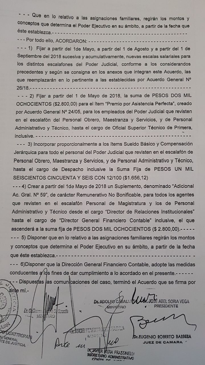 En rigor, la acordada con fecha 8 de mayo de 2018 indica que todos los judiciales -desde ordenanzas hasta cortistas- tendrán un aumento del 10% en su recibo, un 5% aplicable desde el 1 de mayo y otro 5% a partir del 1 de septiembre.
