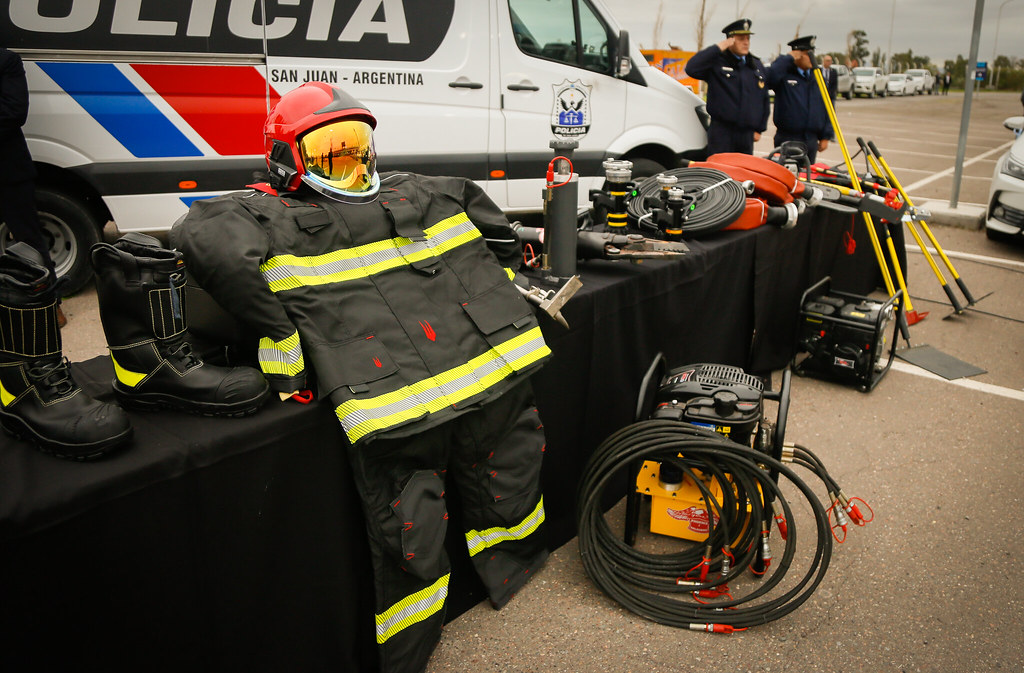 También la repartición de Bomberos de la Policía de San Juan recibió 50 trajes estructurales para su personal y 50 equipos de respiración autónomos compuestos por sistemas de comunicación de alarma baja presión.