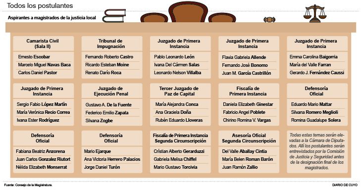 Entre los puestos de mayor peso, los llamados de segunda instancia al tratarse de un tribunal de revisión de sentencias, está el de camarista Civil. Allí fueron ternados el asesor Oficial, Ernesto Escobar; el presidente del Tribunal de Disciplina del Foro de Abogados, Miguel Navas, y el secretario de la Corte, Carlos Pastor. Para el Tribunal de Impugnación Penal, fueron seleccionados el penalista Fernando Castro, el juez de Flagrancia, Ricardo Moine, y el fiscal Renato Roca. En el resto de los cargos, hay funcionarios judiciales y litigantes (Ver infografía). En ese marco, hay magistrados que pueden ascender. Si eso sucede, se disparará otro concurso.