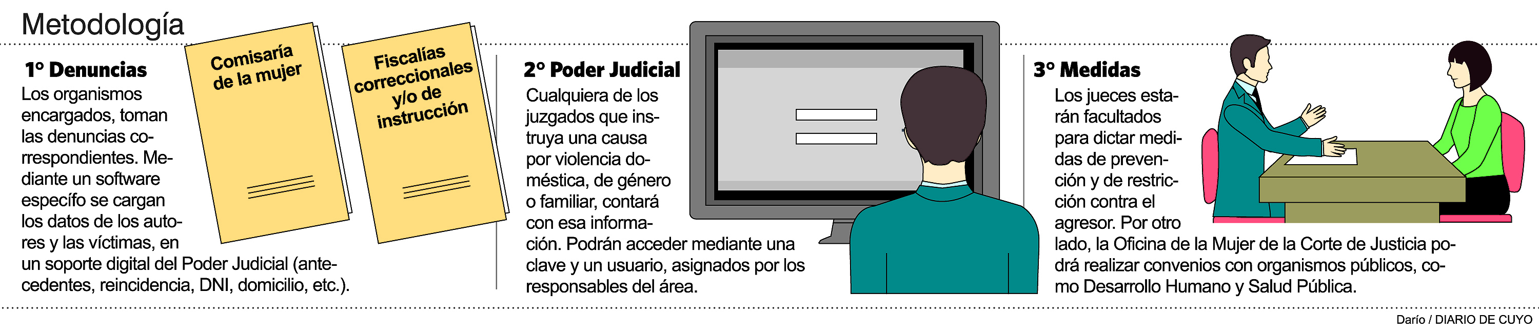El punto de partida es básico, pero a la vez, clave porque marcará el camino a seguir: en un registro informático se cargarán las denuncias con los datos tanto de los agresores como de las víctimas en el seno familiar. Así, se conformará un banco de información estadística que hará sonar la alarma de manera inmediata cuando la mujer vuelva a ser atacada. De esa manera, obligará a los policías, fiscales y jueces a desencadenar acciones para proteger a la damnificada, como ordenar la detención del sospechoso o medidas que restrinjan su acercamiento. La celeridad de la actuación no es menor, ya que la demora puede costar una vida en los casos de violencia familiar. Con esa meta, la Corte de Justicia apuesta a poner en marcha en julio el registro de violencia doméstica para combatir ese flagelo.