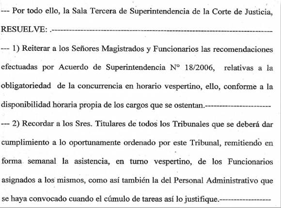 Por otro lado, el acuerdo del máximo tribunal además le recordó a los jueces que tienen la facultad de convocar a los funcionarios (secretarios y prosecretarios) y a los empleados a desempeñar tareas por la tarde durante 2 horas, bajo la misma remuneración que reciben mensualmente. A diferencia de los magistrados, los funcionarios y empleados trabajan por 6 horas en la mañana (de 7 a 13), por lo que con ese recargo se cumplirían las 8 horas establecidas en la legislación laboral. En ese sentido, la Corte dispuso que si alguno de los convocados faltaba, los jueces podrán aplicarle sanciones que van desde un apercibimiento hasta la suspensión.