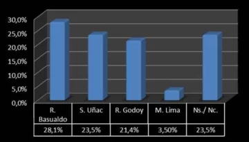 San Juan, 26 de mayo.- A tres días y fracción que el gobernador Gioja anunciara que no se va a presentar a un nuevo mandato, la presidenta el Partido Producción y Trabajo difundió en su Facebook una encuesta hecha por una consultora bonaerense (FN y asociados) donde pone a su jefe político, Roberto Basualdo, en primer lugar.