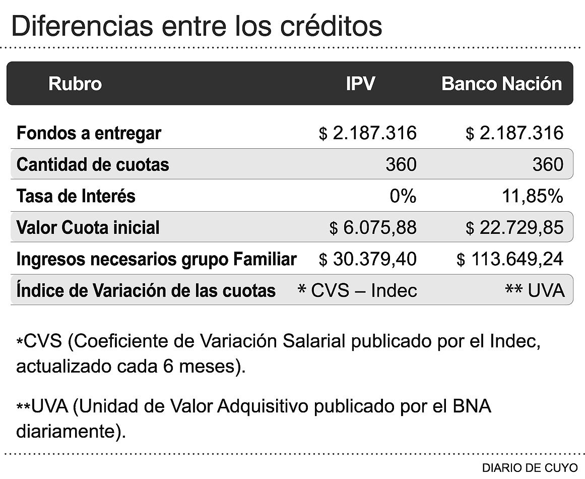 El plan "Mi Casa, mi hogar" del IPV es un sistema de fondos accesibles para todos aquellos ciudadanos que cuentan con los ingresos necesarios para pagar una cuota de un crédito hipotecario y un terreno a su nombre para construir su casa. El mecanismo es beneficioso frente a cualquier préstamo similar en el sistema bancario privado, incluso comparado con el que otorga el Banco Nación, a través de los créditos UVA (ver infografía). La diferencia más sustancial es que, para la misma cantidad de recursos, el ingreso familiar mínimo que requiere el IPV para acceder al crédito es de 30.379 pesos, mientras que en la opción privada los fondos necesarios ascienden a 113.649 pesos. Además, el valor de la primera cuota también es desigual, al punto que en el primer caso es de 6.075 pesos, y el segundo representa una cifra un 274 por ciento más cara.