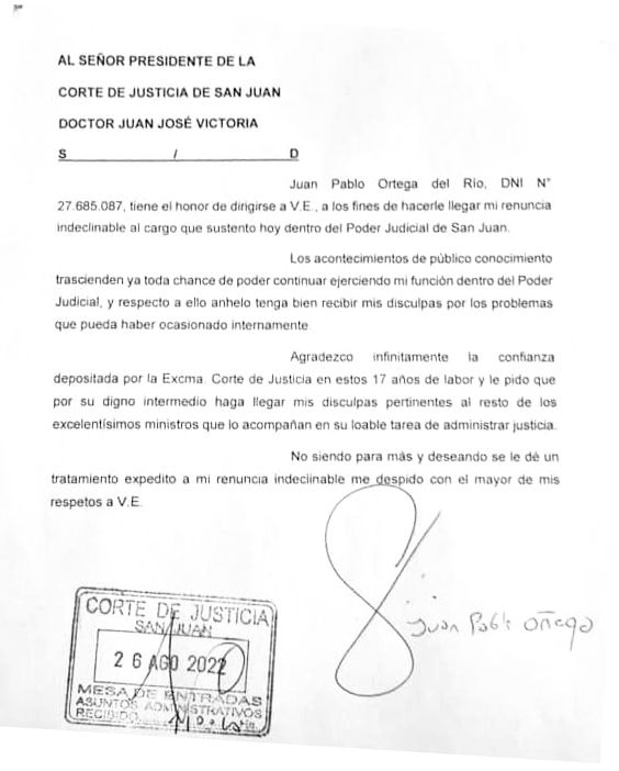 Este diario accedió al escrito que el ahora exfuncionario judicial escribió, dirigido a Juan José Victoria, presidente de la Corte. En el mismo Ortega expone su "renuncia indeclinable al cargo que sustento hoy dentro del Poder Judicial de San Juan".
