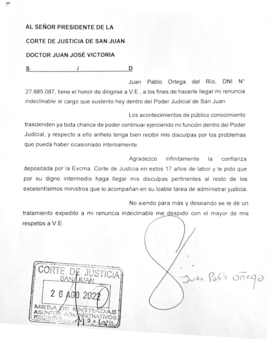 Este diario accedió al escrito que el ahora exfuncionario judicial escribió, dirigido a Juan José Victoria, presidente de la Corte. En el mismo Ortega expone su "renuncia indeclinable al cargo que sustento hoy dentro del Poder Judicial de San Juan".