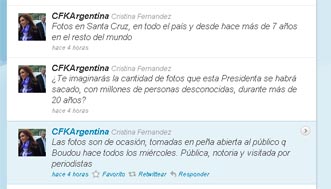 Buenos Aires, 24 de octubre.-En su cuenta de Twitter, la jefa de Estado llamó "caranchos mediáticos" a los medios de prensa que publicaron hoy las imágenes y dijo que se trataron "de fotos de ocasión" que fueron sacadas en una peña "abierta al público" que todos los miércoles organiza el ministro Boudou.
