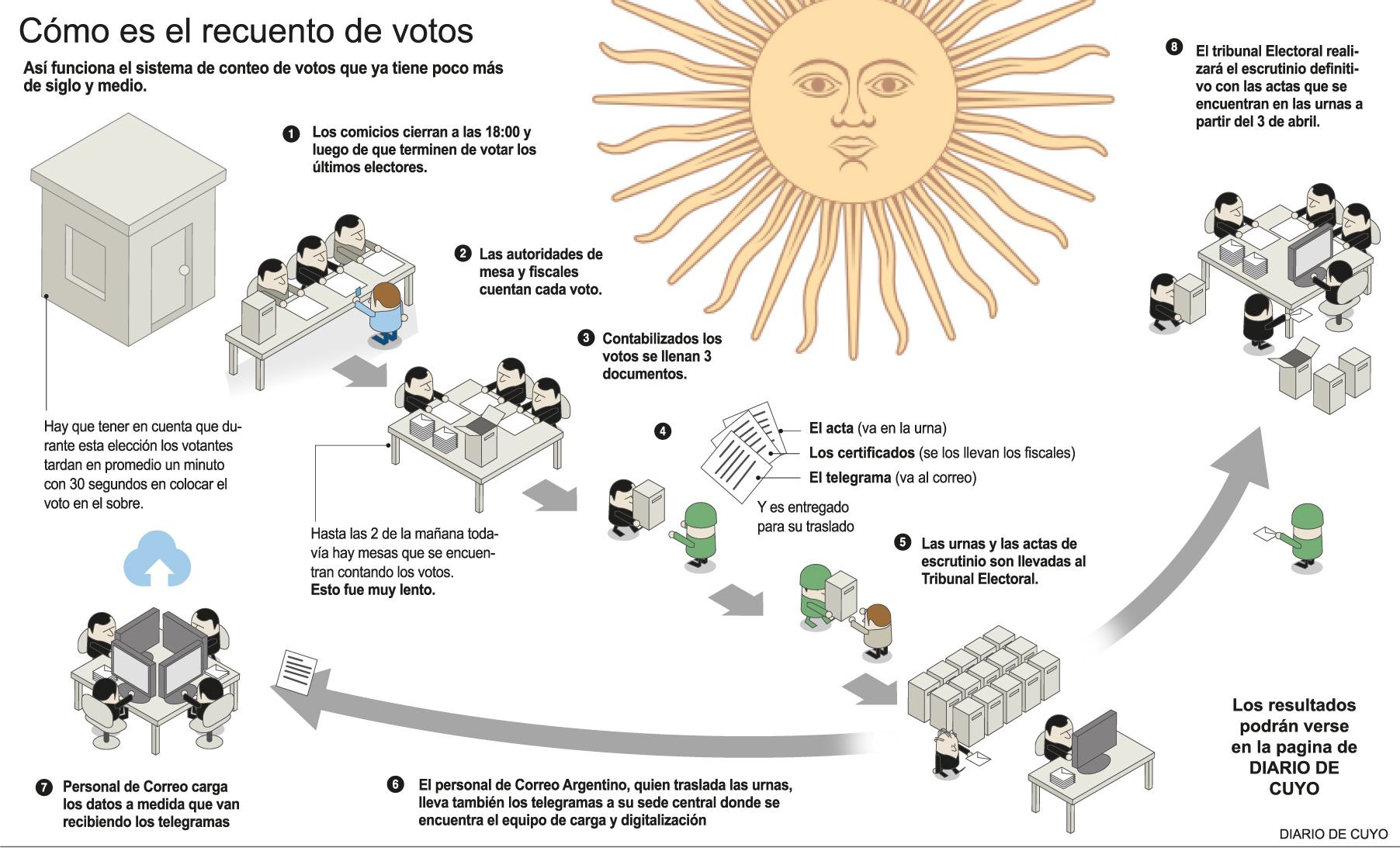 Según calculan en el Tribunal Electoral de la provincia, los primeros resultados estarán a las 20, mientras que una tendencia firme recién se conocerá cerca de las dos de la madrugada. Este primer conteo electoral, según reafirmaron en la Justicia, no tiene ninguna validez legal, mientras que el recuento oficial comenzará el miércoles a las 8 y se espera que concluya el viernes de esta semana, si es que no existe ningún inconveniente que provoque un retraso en los tiempos. Ese sí tiene validez.