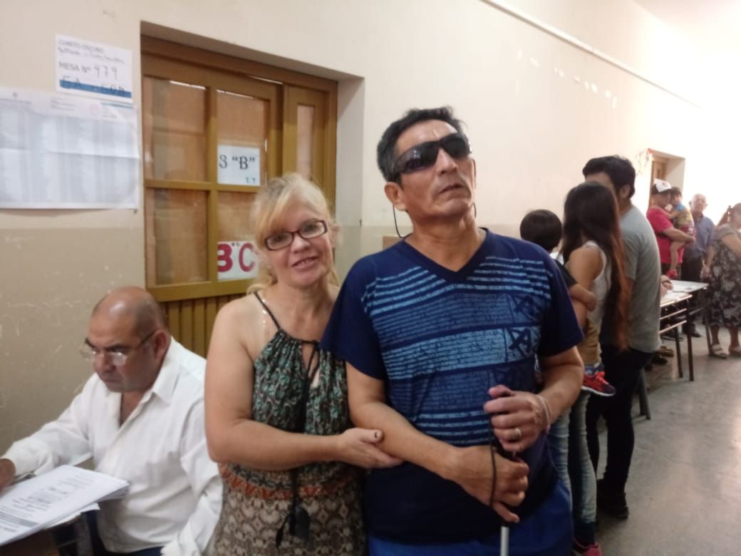 Miguel Ángel Robledo, de 55 años, votará por primera vez desde que perdió la visión tras un coma diabético. El hombre pidió información respecto a cómo es el mecanismo para que pueda votar y será su esposa quien ingrese con el al cuarto oscuro. "Estoy muy entusiasmado", dijo mientras recorría del brazo de Claudia la escuela chimbera.