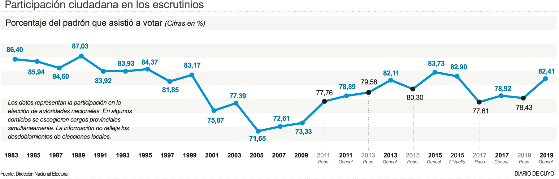En promedio, los sanjuaninos han tenido una alta concurrencia a las urnas desde 1983. Contabilizando todos los comicios nacionales, la provincia ha superado por poco el 80 por ciento del padrón electoral. El pico más alto se concretó en 1989, en la elección presidencial para designar al sucesor de Raúl Alfonsín y en la que en la provincia también se escogieron tres diputados nacionales. En un comicio que resultó dividido, cada una de las tres bancas en juego fue para los tres espacios con mejores resultados (la Cruzada Renovadora, el FreJuPo y la UCR). En esa elección, la participación alcanzó el 87,03 por ciento del padrón, sumado el plus de que también se eligió jefe del Estado nacional. En las antípodas estuvo el comicio de 2005, en el que el Frente para la Victoria logró dos bancas en el Senado y dos en Diputados, mientras que Producción y Trabajo se hizo de un escaño para cada Cámara. En ese caso, el nivel de asistencia fue el más bajo desde 1983: sólo el 71,65 por ciento del padrón se presentó a votar (ver infografía).