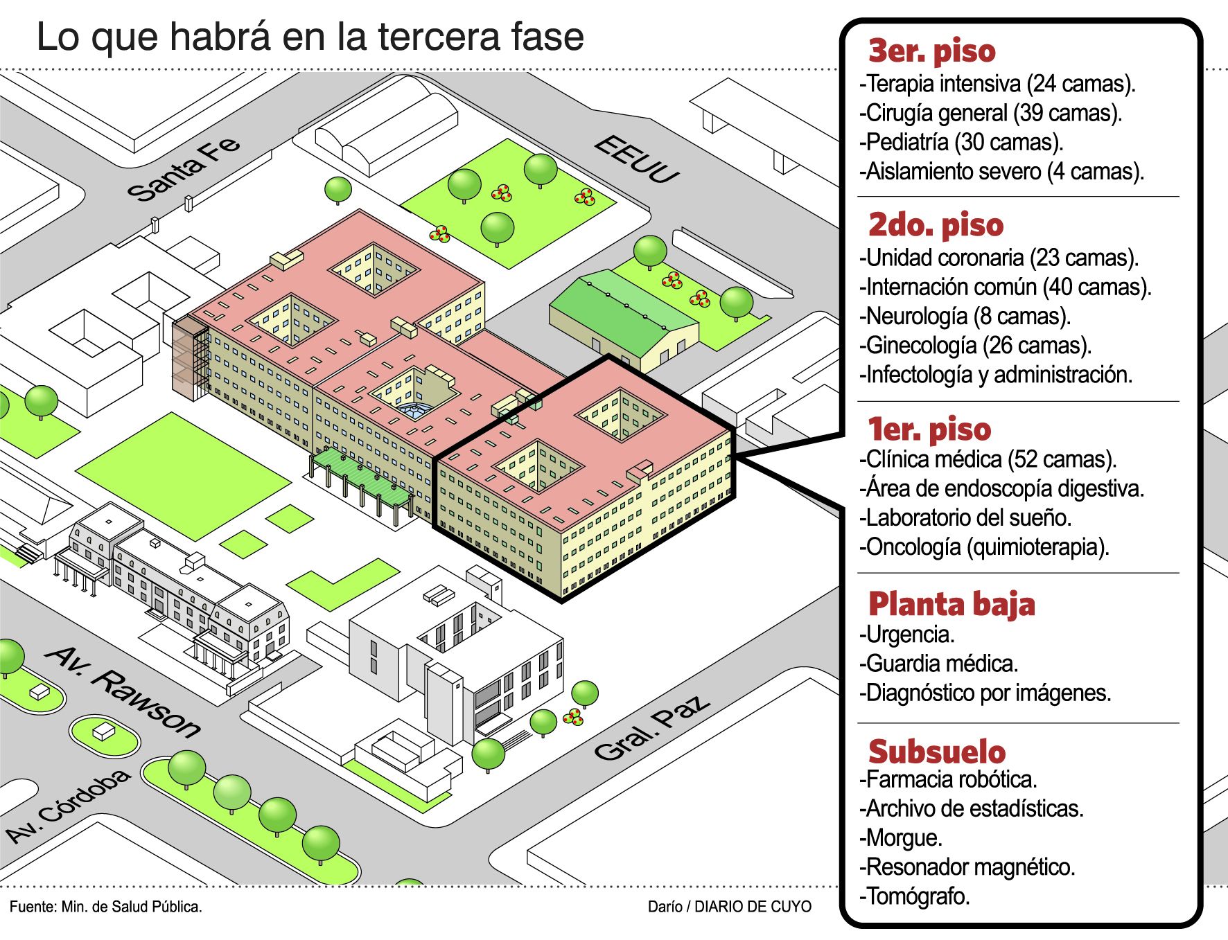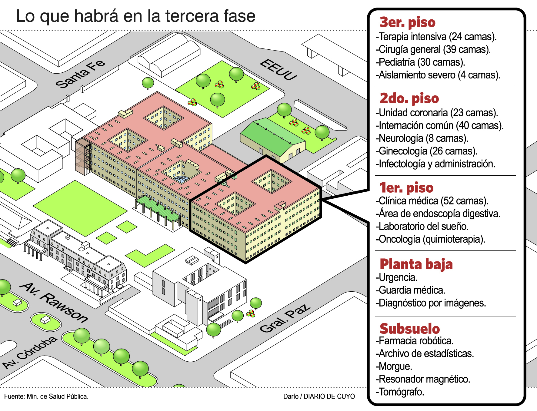 Entre las novedades que aportará la tercera fase del Hospital Rawson se encuentra el aumento de camas en casi todas las áreas, que pasarán de las 420 que existen actualmente hasta las 540. Un ejemplo de esto es que hoy la terapia intensiva cuenta con 10 unidades para adultos y luego de la puesta en marcha, contará con 24 en total. Un caso similar ocurre con la unidad coronaria, que pasará de 6 camas a tener 23, o con cirugía general que de 26 lugares sumará 13, hasta llegar a 39, con una particularidad, las 26 camas que libera cirugía general servirán para ampliar el servicio de pediatría, indicó Beatriz Salanitro, directora del hospital. El centro de salud contará con cinco pisos, contando desde el subsuelo y cada nivel tiene su particularidad (Ver infografía).