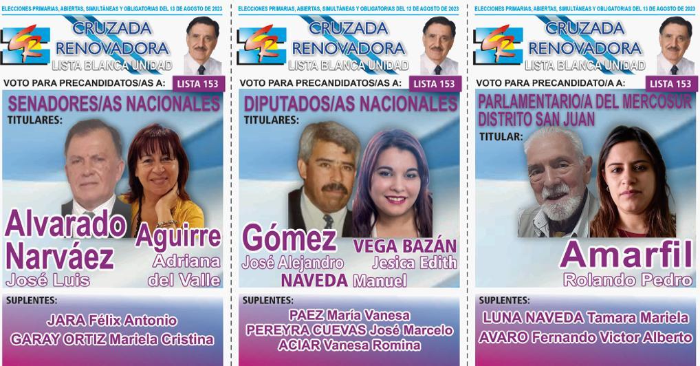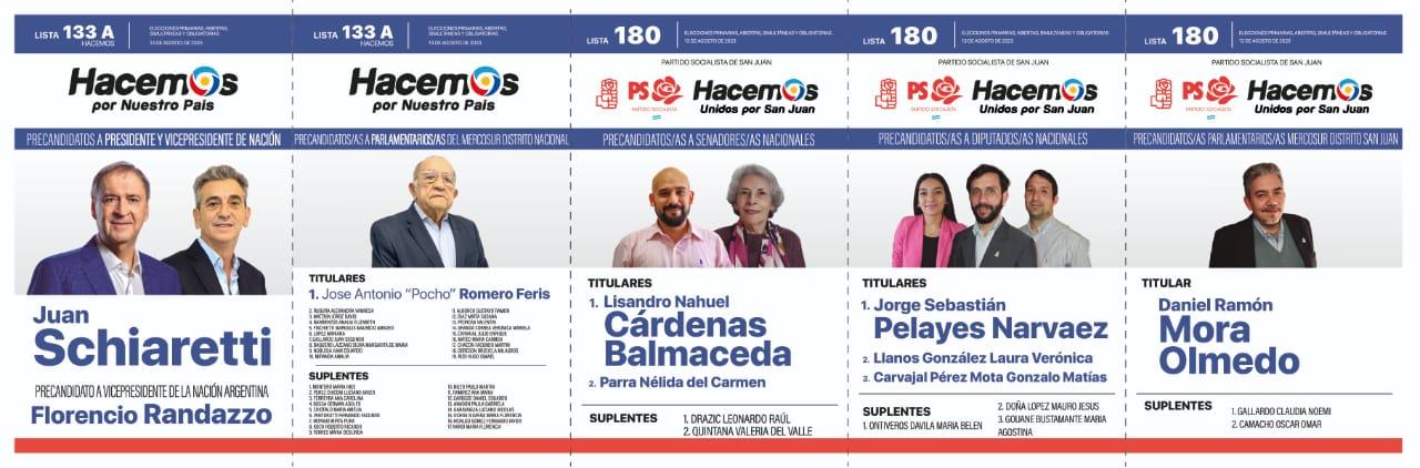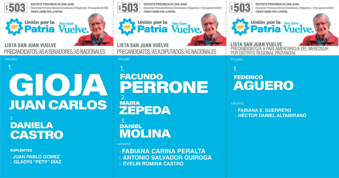En San Juan, cuatro son las coaliciones que competirán en las PASO y solo en tres habrá internas. En Unión por la Patria (las dos boletas tienen a Massa como precandidato a presidente), Juntos por el Cambio (una tiene a Larreta y la otra a Bullrich) y el Frente de Izquierda y de Trabajadores – Unidad se presentaron dos listas (una tiene a Bregman y la otra a Solano), mientras que La Libertad Avanza tuvo un sólo armado (llevan a Milei como precandidato a presidente). Además, habrá cuatro partidos que jugarán en soledad: la Cruzada Renovadora (no lleva precandidato a presidente), Movimiento Libres del Sur (no lleva precandidato a presidente), el Socialismo (lleva a Schiaretti) y el Partido Popular (no lleva precandiato a presidente).