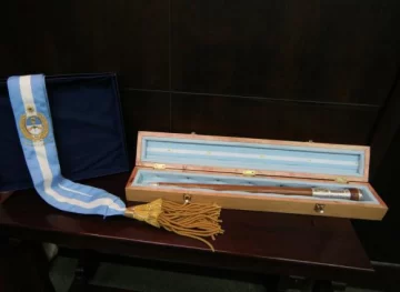 Con Uñac, la banda, que simboliza la autoridad, fue confeccionada en la Sastrería Militar de la Nación y lleva además del escudo provincial dos borlas doradas.
