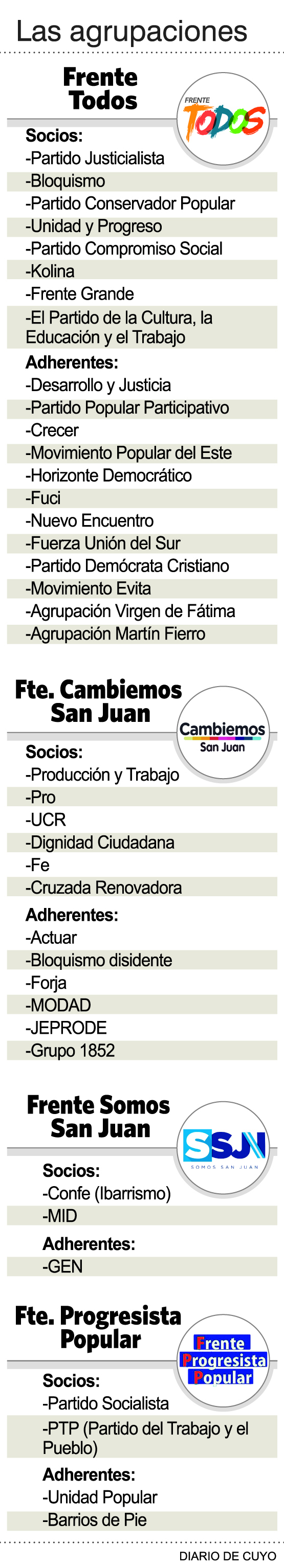22 Son los partidos políticos en San Juan reconocidos por la Cámara Nacional Electoral. Ocho están en el Frente Todos, seis en Cambiemos, dos en Somos San Juan, dos en el Progresista y cuatro juegan solos.