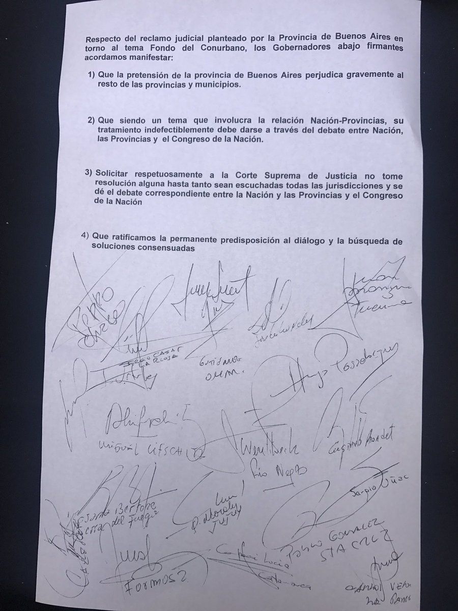 "Respecto del reclamo judicial planteado por la provincia de Buenos Aires en torno al tema del Fondo del Conurbano los Gobernadores abajo firmantes acordamos manifestar: