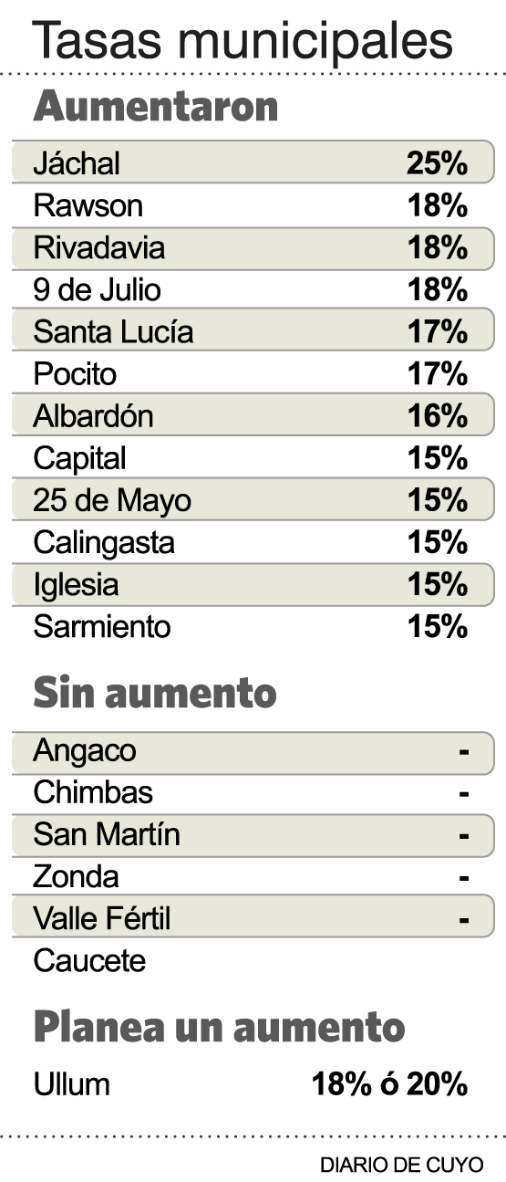 Como sucede cada fin de año, en los Ejecutivos departamentales analizaron cobrar un porcentaje mayor de las tasas municipales, el canon que perciben por la prestación de servicios. En ese balance, 12 comunas ya decidieron implementar una suba, que los vecinos pagarán a partir de febrero, y otra va camino a hacerlo. En ese lote se encuentran Jáchal, Rawson, Rivadavia, 9 de Julio, Santa Lucía, Pocito, Albardón, Capital, 25 de Mayo, Calingasta, Iglesia y Sarmiento, más Ullum, cuyos aumentos van del 15 al 25 por ciento (Ver infografía). En cambio, en Angaco, Chimbas, San Martín, Zonda, Valle Fértil y Caucete definieron no instrumentar ningún incremento para este año.