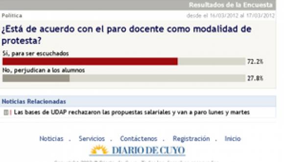 Al respecto, DIARIO DE CUYO ONLINE publicó una encuesta con la siguiente consigna: ¿Está de acuerdo con el paro docente como modalidad de protesta? De los 1.518 votantes, el 72,2% expresó estar de acuerdo con la medida de fuerza para que los docentes sean escuchados.