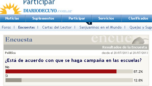 Luego de conocerse la noticia, este medio publicó una encuesta para conocer la opinión de los lectores con la siguiente consigna: ¿Está de acuerdo con que se haga campaña en las escuelas?”. Del sondeo participaron 1.143 personas, de las cuáles el 87, 2% opinó no estar de acuerdo con los arribos de candidatos a establecimientos educativos, mientras que el restante 12, 8% respaldó la iniciativa que la titular de Educación no descarta que se lleve adelante.