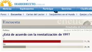 San Juan, 18 de abril.- Luego de que el pasado lunes la presidenta Cristina Fernández de Kirchner realizara el histórico anuncio en cadena nacional, sobre la expropiación del 51% del paquete accionario de Repsol YPF por parte de Argentina, DIARIO DE CUYO ONLINE publicó una encuesta para que los lectores opinen sobre el tema que se llevó toda la atención durante la semana.
