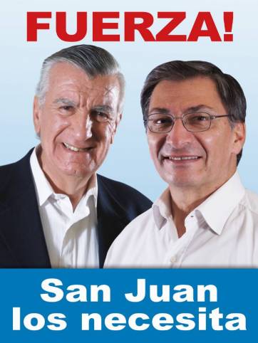 San Juan, 18 de Octubre.- Los carteles dispuestos en la vía pública para propaganda oficial aparecieron con mensajes de aliento para el gobernador Gioja y el diputado Nacional, Daniel Tomas. “Fuerza, San Juan los necesita”, el lema elegido.