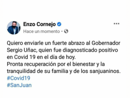 Este domingo, el gobernador Sergio Uñac dio positivo en Covid-19 y luego de que se conociera su estado de salud, funcionarios provinciales y nacionales se sumaron en las redes sociales a brindarles su apoyo.