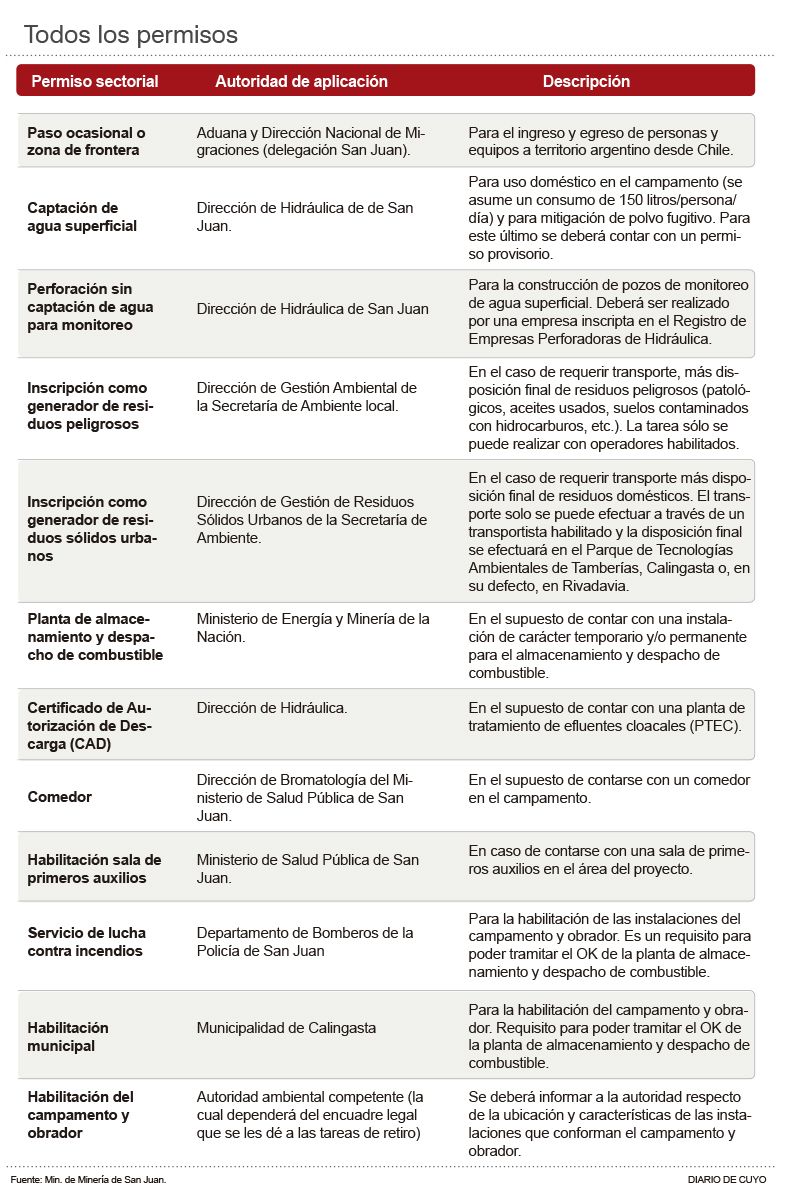 Pero también deben contar con los permisos argentinos para iniciar los trabajos de remoción y de actividad en la cordillera sanjuanina (ver infografía). La empresa había accedido a retirar más de 500 neumáticos de las gigantescas movilidades mineras que había dejado en la escombrera. Para llevar a cabo tal maniobra, se necesitaron ocho meses para obtener todas las autorizaciones. Por eso, las autoridades provinciales reconocieron la demora, por lo que apuntan a que una orden del juez Rago Gallo acelere los plazos, ya que la idea es que las tareas comiencen en diciembre.