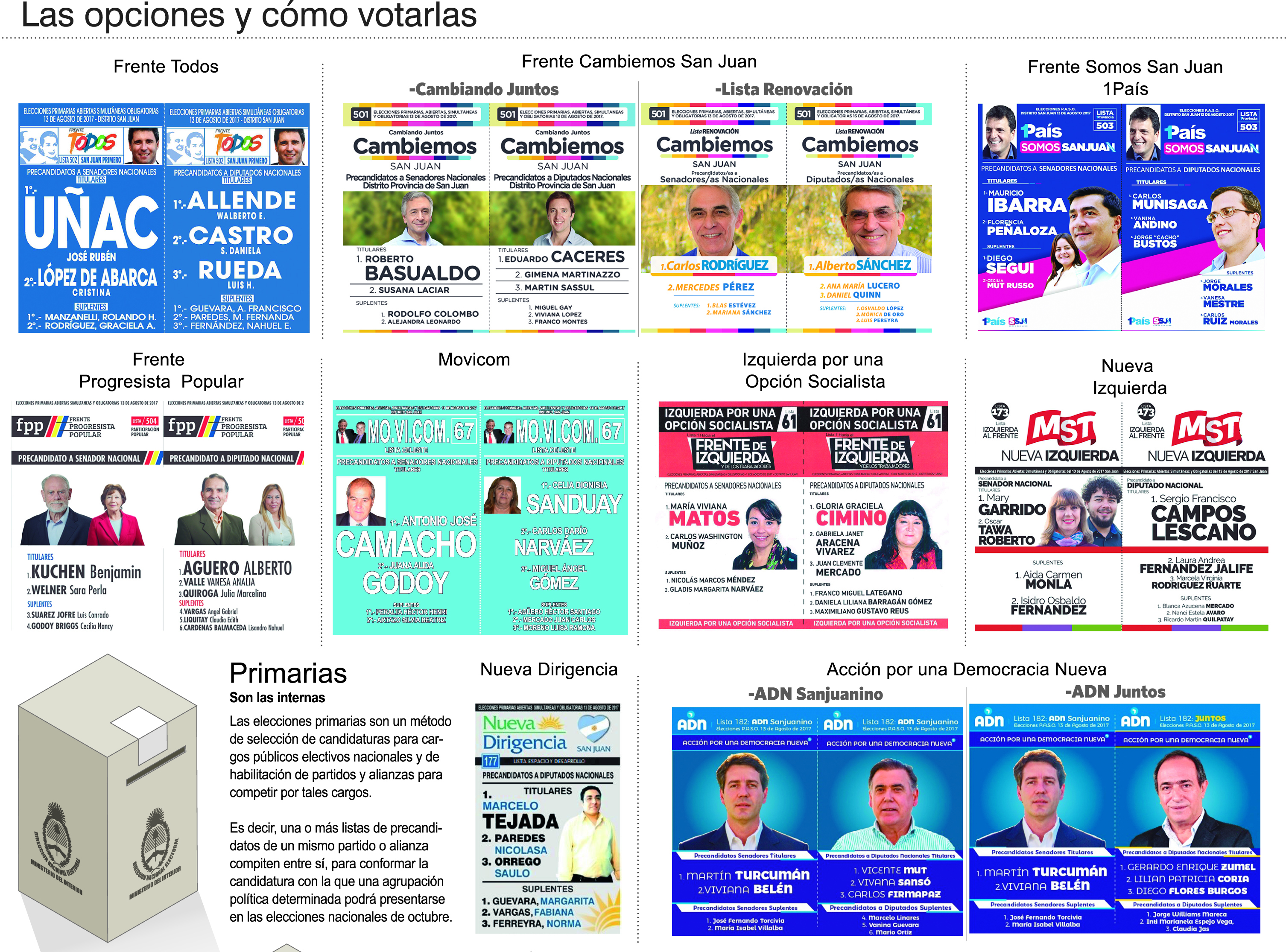 En el resto tampoco habrá pelea puertas hacia adentro y en el caso de Somos San Juan, con Mauricio Ibarra y Carlos Munisaga a la cabeza, el objetivo será posicionarse como alternativa opositora y ser la referencia del tigrense Sergio Massa, que apunta a la presidencia en 2019. Los demás, el Frente Progresista, la Nueva Izquierda, la Izquierda Socialista, Movicom y Nueva Dirigencia, enfrentarán el desafío de convertirse en una opción para los sanjuaninos y para ello primero deben superar el piso y no quedar eliminados.