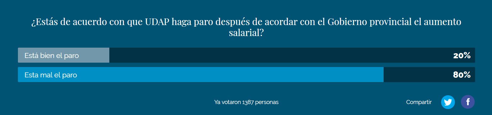 En casi 5 horas, 1.387 sanjuaninos votaron en la encuesta propuesta por DIARIO DE CUYO donde se planteó la decisión del gremio docente UDAP de ir al paro lunes y martes, adhiriendo a la medida dispuesta este viernes por la tarde por CTERA.
