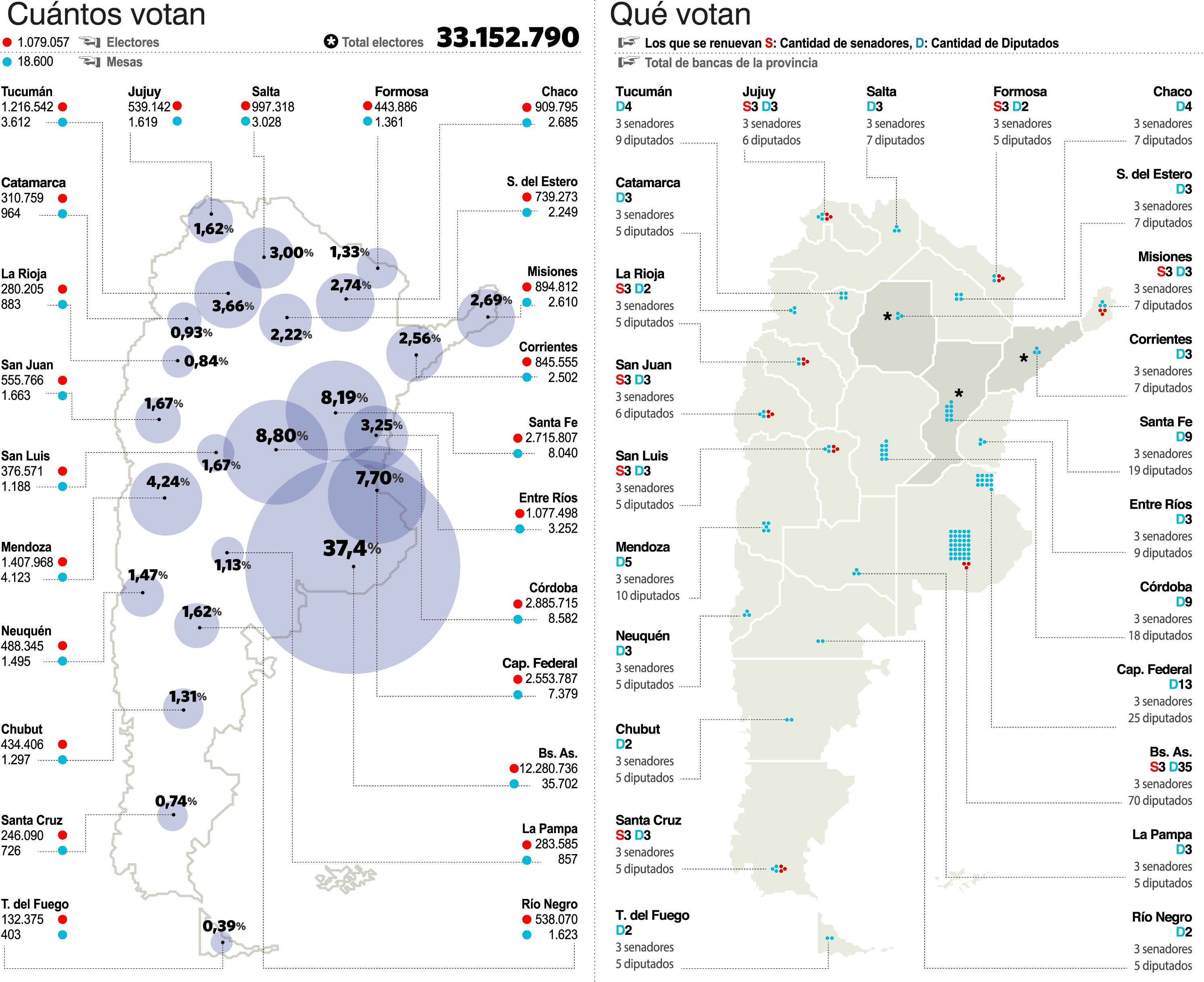 De estos comicios saldrán las listas definitivas de cada fuerza para las legislativas del 22 de octubre, en las que se renueva un tercio del Senado (24 escaños) de ocho provincias: Buenos Aires, San Juan, Formosa, Santa Cruz, San Luis, Misiones, La Rioja y Jujuy. También en estas elecciones se renueva la mitad de las bancas en Diputados (127 escaños).