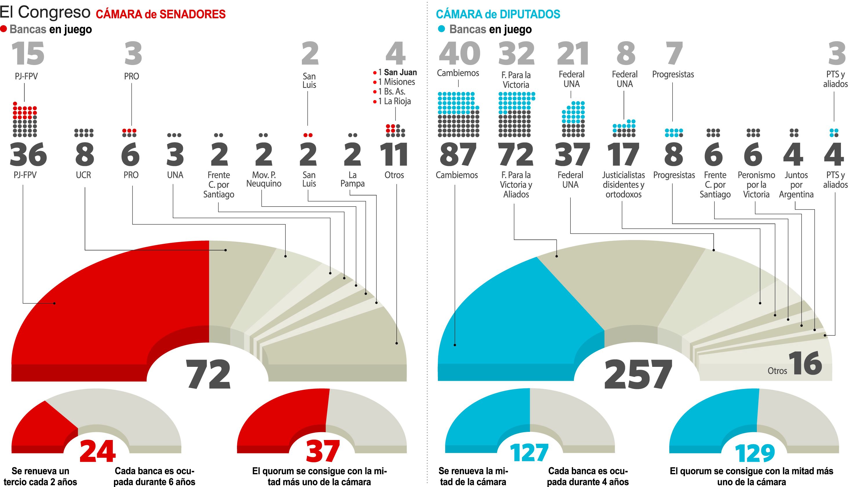 La coalición oficialista es el bloque que más bancas pone en juego 40 escaños de 87 que tiene actualmente. El FPV-PJ, como expresión mayoritaria del peronismo, pondrá en juego en octubre 32 diputados de los 72 que componen el bloque, mientras en el Senado el justicialismo arriesgará 16 escaños de los 42 que conforman la bancada mayoritaria. Cambiemos pone en juego 4 de 17.