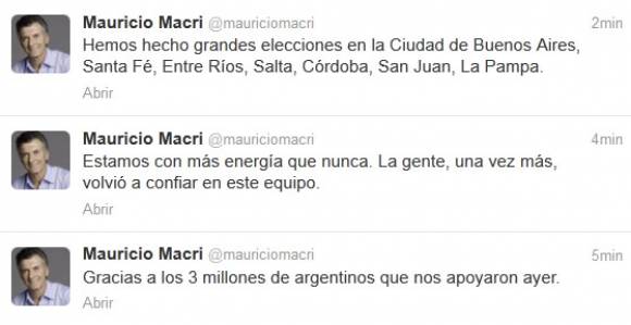 Macri continuo manifestando vía twitter “gracias a los tres millones de argentinos que nos apoyaron ayer. Estamos con más energía que nunca. La gente, una vez más, volvió a confiar en este equipo”, finalizó.