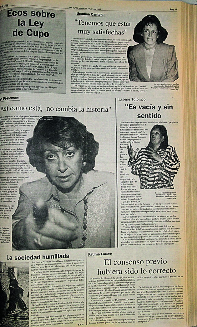 En San Juan también se presentó un proyecto de ley en 1991, pero fue cajoneado por los hombres de la política de la época, habían dicho legisladoras como la bloquista Gladys Pósleman y la radical Fátima Farías. Tres años después, la iniciativa fue nuevamente impulsada por la diputada Ursulina Cantoni, la cual fue sancionada el 13 de octubre bajo el número 6.515. Pero en el camino perdió una parte sustancial del texto. Si bien se mantuvo la "cuota" del 30 por ciento, se le suprimió la frase que señalaba la "posibilidad de resultar electas". Desde su origen, la normativa recibió críticas. Pósleman había resaltado que "es una ley innecesaria que, así como está, no cambia la historia. Hemos dado un paso atrás, ya que ese 30 por ciento que pregona puede estar al final de la lista de candidatos, con lo cual, las mujeres seguiremos siendo objeto de discriminación política". Por su parte, Farías la había calificado de "híbrida" y que "no sirve para nada porque sigue dejando a las mujeres en el último escalón de la política". La autora, hija de Federico Cantoni, había remarcado que se trataba de "una base" porque "cada mujer luchará en su partido por ocupar un lugar".
