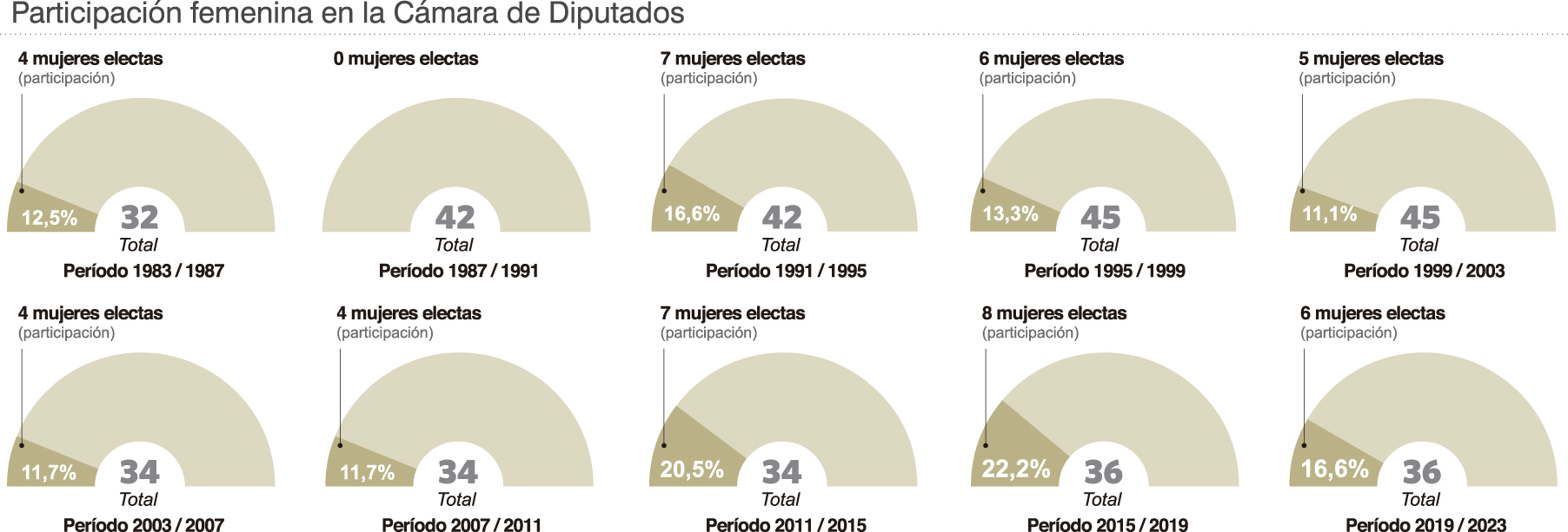 La dimensión del impacto de la participación femenina se verá en la elección 2023. A modo ilustrativo, la Legislatura cuenta con 19 bancas departamentales y 17 proporcionales. En 2019 ingresaron cinco diputadas proporcionales y una departamental. Si ese año se hubiera aplicado la paridad, el salto se hubiera dado en las legisladoras proporcionales, dado que habría tres más: dos por el Frente de Todos al respetar la manera intercalada y una por Juntos por el Cambio. No obstante, no habría modificaciones en las legisladoras departamentales, ya que las listas fueron encabezadas mayoritariamente por hombres en casi todas las alianzas. Y, en ese caso, la distribución igualitaria se hace entre el primer titular y su suplente. De esa forma, con la ley de paridad habría 9 diputadas de 36, lo que representaría el 25 por ciento. De todas formas, es el esquema de hace dos años, ya que en 2023 puede haber más candidatas que encabecen las listas de legisladoras departamentales.
