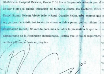 Los tres médicos del Hospital Rawson acusados de no querer ayudar a operar a una paciente, negaron rotundamente la imputación y para demostrarlo, exhibieron documentación. Daniel Sanna, que es el titular del Sindicato Médico, Raúl Reina y Nelson Tello aseguraron que el jefe de Ginecología, Ricardo Villalobos, mintió cuando dejó sentado por escrito que él y su colega Sergio Alé les fueron a pedir colaboración y que recibieron un no como respuesta, a pesar de que estaban sin cumplir ninguna tarea médica. Alé contradijo en parte ese relato y con ese documento en la mano, los profesionales anunciaron que presentarán una querella contra Villalobos. Por otra parte, aportaron planillas de trabajo interno que revelan que en la franja horaria donde sucedieron los hechos ellos estaban interviniendo en partos y coordinando tareas; y un acta notarial que da cuenta de que hasta varios días después del episodio todavía no había ningún sumario en marcha como lo había afirmado el director del nosocomio.