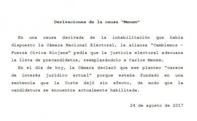 Se trata de una causa derivada de la inhabilitación que había dispuesto la Cámara Nacional Electoral, por la cual la alianza "Cambiemos-Fuerza Cívica Riojana" pedía que la justicia electoral adecuara la lista de precandidatos, reemplazándolo a Menem.