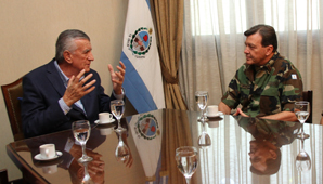 San Juan, 8 de abril.- El jefe del Ejército Argentino, Julio Cesar Milani, llegó a San Juan para realizar una inspección al RIM 22, a la sección de Inteligencia y para saludar al Gobernador Gioja, encuentro que se produjo minutos después de las 13.