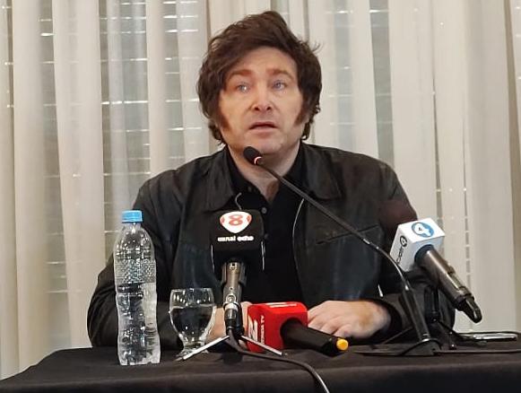 El máximo representante de La Libertad Avanza, Javier Milei, llegó a San Juan y previo a su contacto con la gente que lo sigue hizo declaraciones en un salón del Club Social.