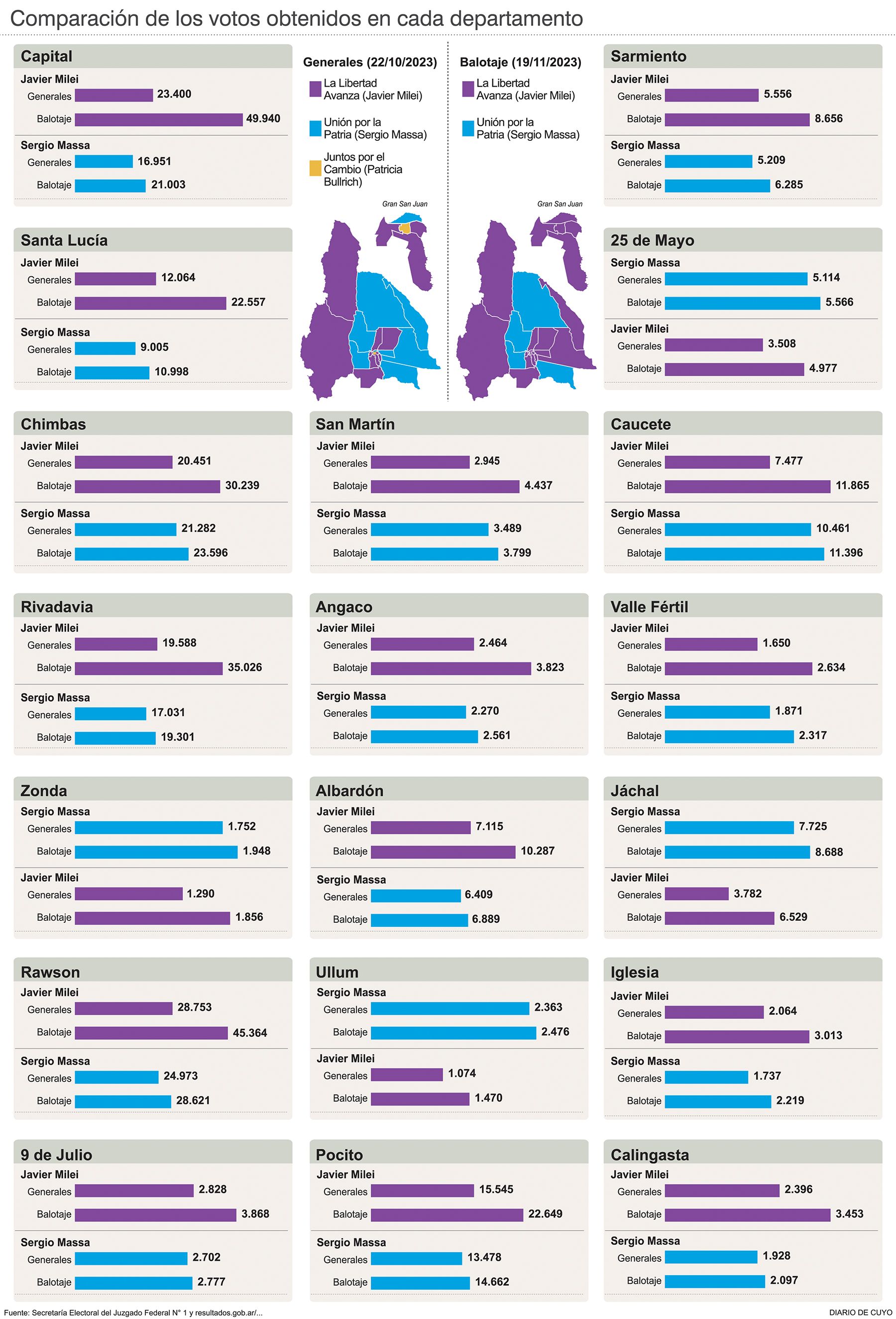 En la general del 22 de octubre, Javier Milei, de La Libertad Avanza, había ganado en San Juan en la categoría de presidente en 10 de los 19 departamentos: Rawson, Rivadavia, Santa Lucía, Pocito, Albardón, Sarmiento, 9 de Julio, Angaco, Iglesia y Calingasta. En el balotaje de ayer, no sólo mantuvo números fuertes en esos distritos, sino que sumó otros cinco: Capital, Chimbas, Caucete, San Martín y Valle Fértil. De esa manera, el libertario consiguió un impactante triunfo en la provincia al cosechar el 60,6 por ciento de los votos (ver infografía). Sergio Massa, de Unión por la Patria (UxP), obtuvo victorias en Jáchal, 25 de Mayo, Ullum y Zonda.