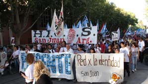 San Juan, 24 de marzo.- Una multitud marchó esta tarde desde la Plaza 25 de Mayo hasta la exLegislatura provincial, en reclamo de justicia, a 38 años del golpe militar que dejó cientos de desaparecidos en todo el país.
