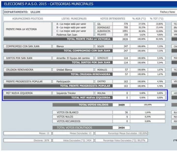 Teniendo en cuenta el escrutinio final publicado por el Tribunal Electoral de la provincia, Molina sacó 0 votos.