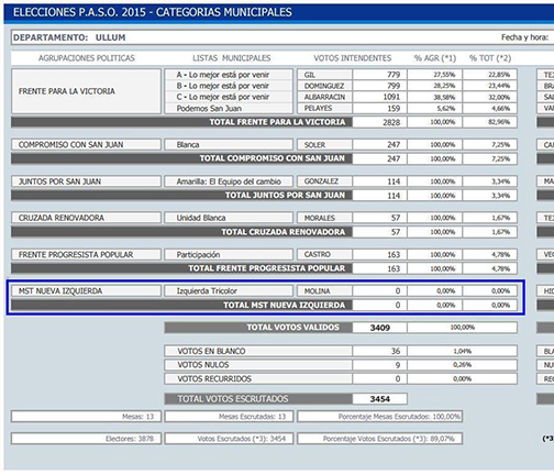 San Juan, 10 de agosto.- El caso llama la atención y es el único que se presentó en la provincia en el marco de estas PASO. Hilario Crecencio Molina, precandidato a intendente de Ullum por la MST Nueva Izquierda no recibió votos de su familia, de amigos, de los fiscales de su partido y ni siquiera de él mismo.