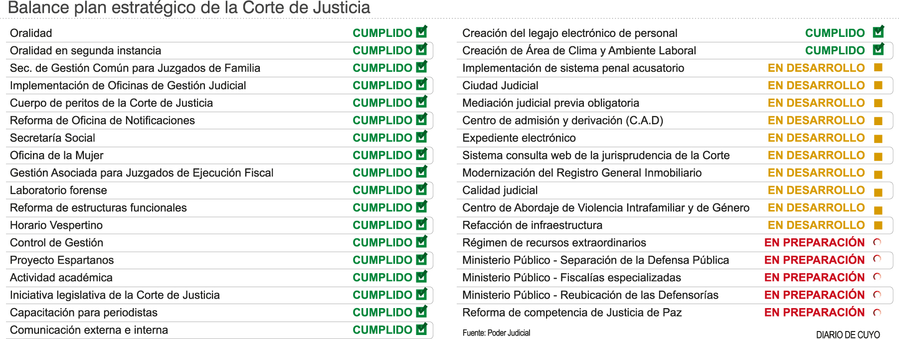 En un hecho histórico para la Corte de Justicia, el presidente del cuerpo, Guillermo De Sanctis, presentó un balance de gestión. El máximo órgano de justicia local rindió cuentas del año que pasó e hizo una evaluación sobre los 35 objetivos propuesto en el lanzamiento del año judicial. Destacó que 20 se cumplieron, diez están en desarrollo y el resto en preparación para ser cumplidos en el corto plazo. Según manifestó el presidente, la implementación del sistema oral en el fuero Civil, Laboral, Comercial Especial y Contencioso Administrativo, hizo punta sobre el resto de las iniciativas implementadas y significó "un cambio de paradigma" sobre la administración de justicia, que tendrá un paso más con la puesta en marcha del sistema acusatorio este año. Según De Sanctis, con la oralidad, "aquellos juicios que antes demandaban entre cuatro y cinco años, ahora tienen sentencia en ocho meses". Por otro lado, indicó que a partir de marzo, la oralidad estará implementada en la segunda instancia, esto es, en las Cámaras de Apelaciones.