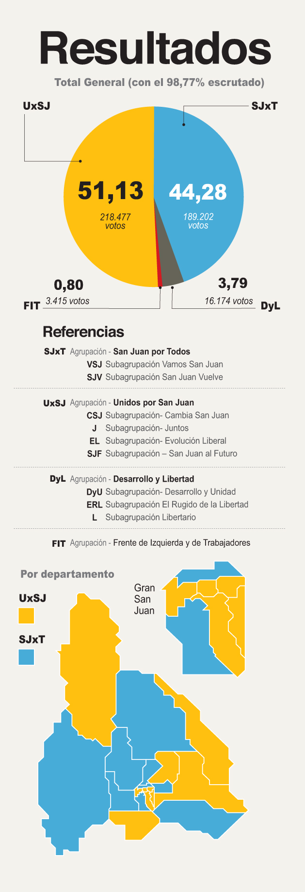 El frente Unidos por San Juan tuvo el 47.16% del total de los votos, por eso se ubicó como segunda fuerza pese a tener el candidato más votado.