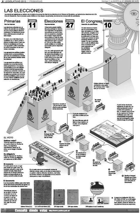 Las elecciones primarias se realizarán en todo el país el segundo domingo del mes de agosto de los años impares, este año el 11 de agosto, entre las 8 y las 18 horas. En las Primarias y en las nacionales se vota en el mismo lugar. Se puede verificar el lugar de votación en: www.padron.gob.ar
