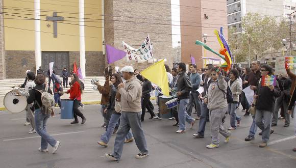 Pasado el mediodía, la marcha pro gay con todos los presentes, enfiló por Jujuy y luego por Central, para dar una vuelta a la Plaza 25 y volver al Rectorado. Fue un tránsito pacífico -hubo instrucciones precisas de los organizadores en ese sentido- con poco eco en la gente que se cruzaba, salvo por algunos grupos de adolescentes en la plaza que levantaban carteles con leyendas como "queremos mamá y papá" y, algunos que gritaban groserías. La escasa presencia policial se limitó a cortar las calles, salvo en la puerta de la Catedral donde hubo más concentración de uniformados.