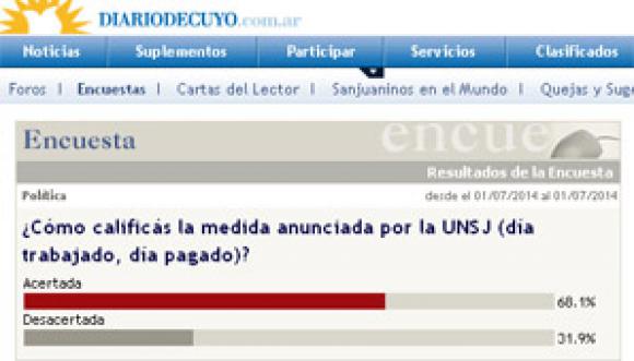 Bajo la consigna “¿Cómo calificás la medida anunciada por la UNSJ (día trabajado, día pagado)?”, casi 300 personas participaron del sondeo. La mayoría, el 68,1%, expresó que la medida de la UNSJ es “acertada”, mientras que el restante “31,9% calificó la iniciativa como “desacertada”.